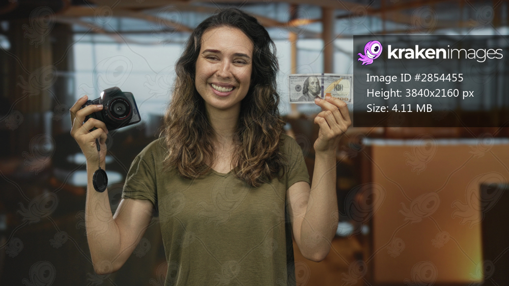 Hispanic woman smiling holds digital camera and crisp banknote inside brightly lit hotel building; success joy.