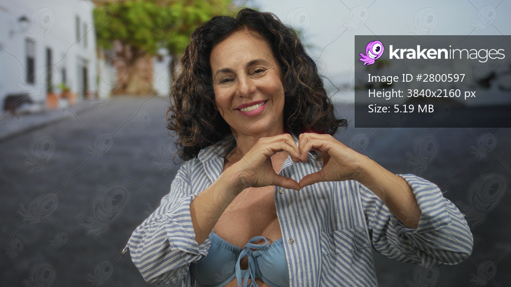 Hispanic woman smiling in bikini and shirt outdoors on sunny street showing love with hands.