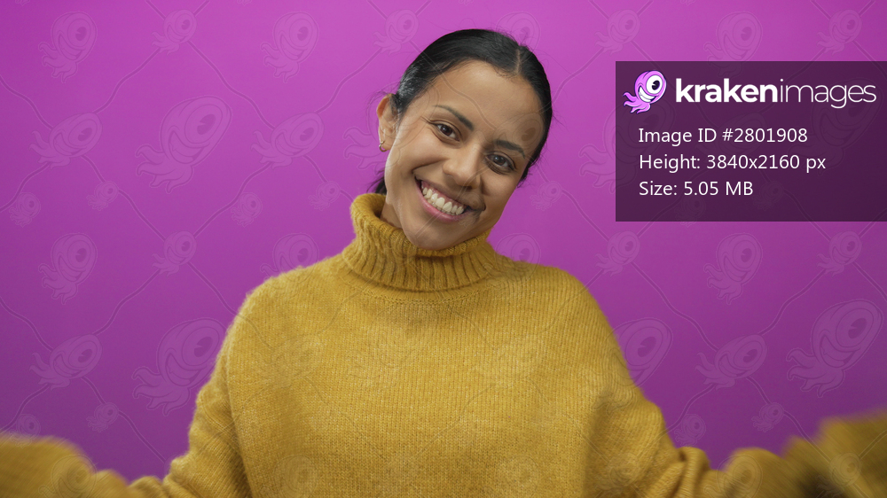 Hispanic woman smiling joyfully in a cozy yellow sweater with hands raised in excitement against a vibrant pink background, exuding happiness and positivity. - Kraken Images