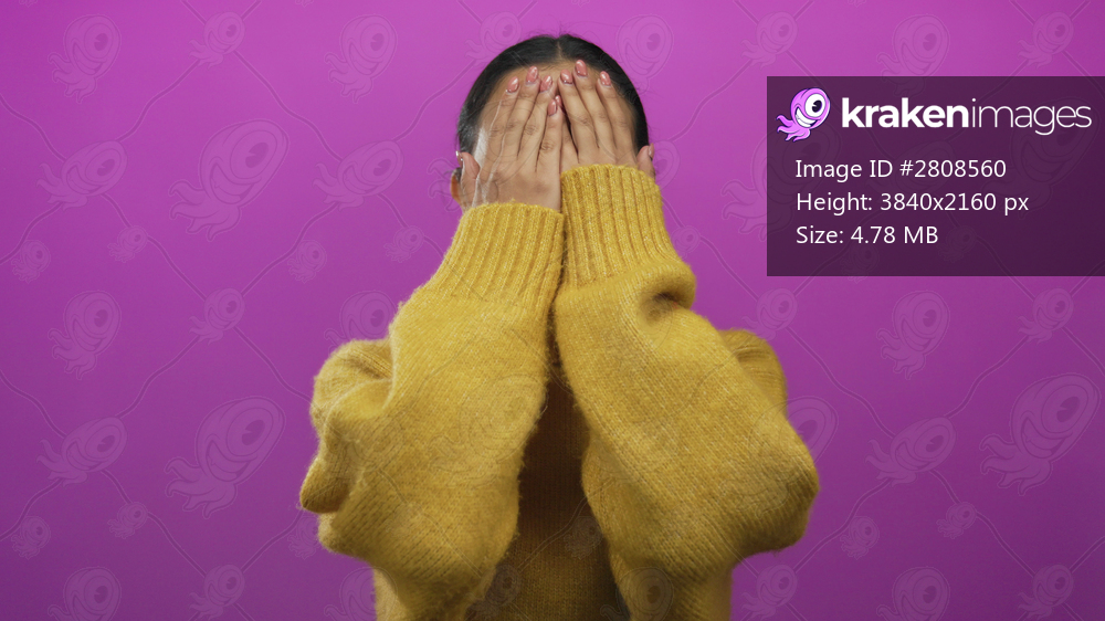 Hispanic woman smiling joyfully in a cozy yellow sweater with hands raised in excitement against a vibrant pink background, exuding happiness and positivity. - Kraken Images