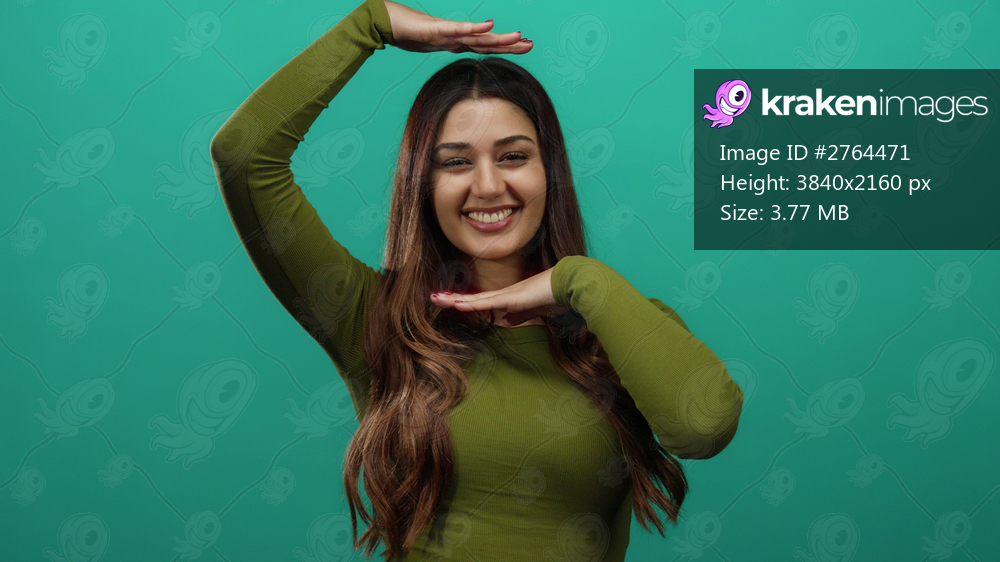 Hispanic woman smiling and making a framing gesture with her hands over her head, isolated against a vibrant green background wall.