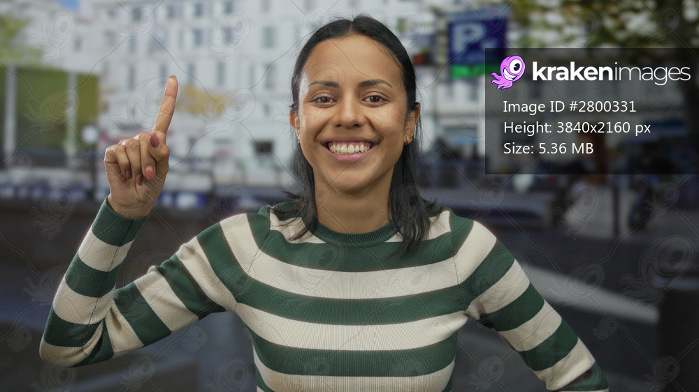 Hispanic woman smiling on a busy street outdoors in a vibrant city, gesturing with her hand in a striped shirt, exuding joy and positivity in an urban setting. - Kraken Images