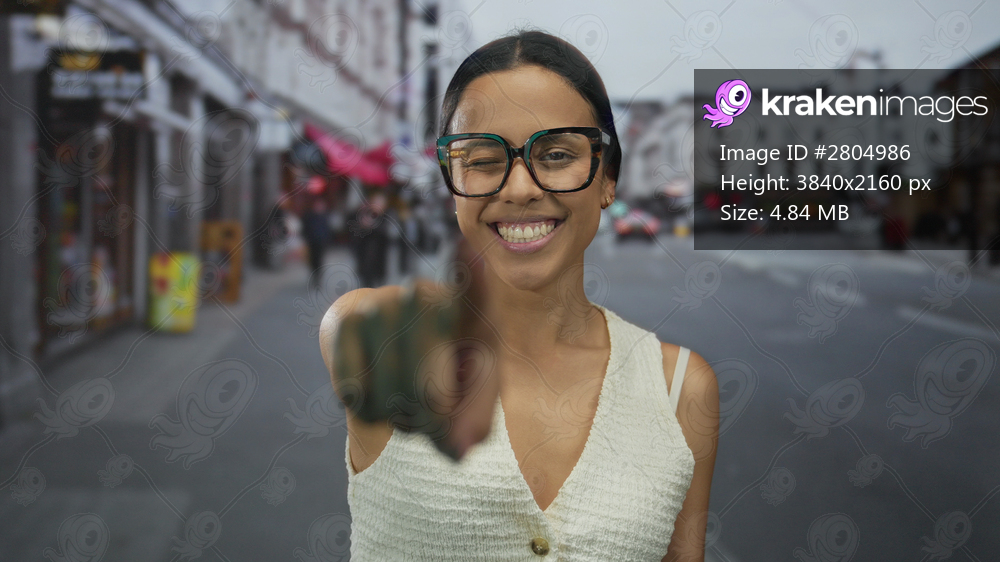 Hispanic woman smiling on a vibrant street, wearing glasses, pointing directly at the camera, conveying positivity in an urban setting with storefronts and blurred pedestrians. - Kraken Images