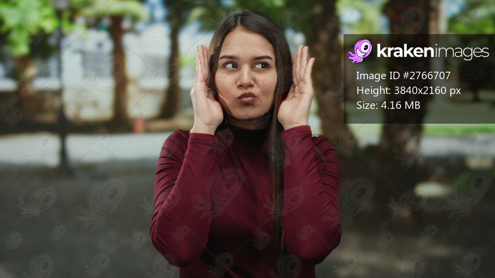 Hispanic woman smiling outdoors in a park, playfully covering and uncovering her face with hands, wearing a burgundy shirt amidst the lush greenery of a vibrant recreational area. - Kraken Images