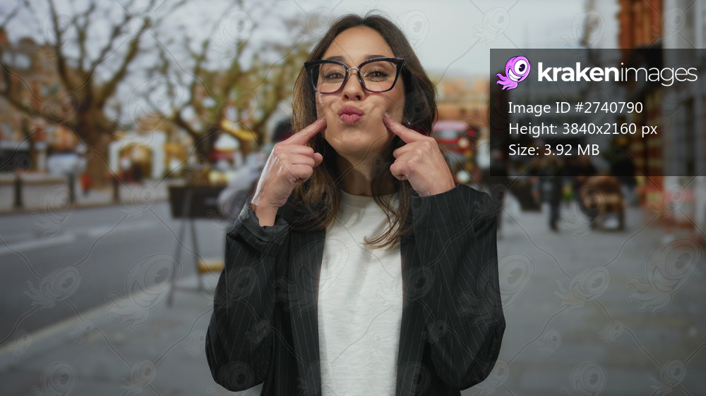 Hispanic woman smiling outdoors on a city street in london, wearing glasses and a casual white shirt, surrounded by urban traffic and people.