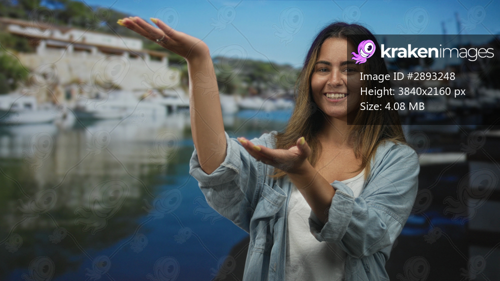 Hispanic woman smiling with palms up gesture at a port pier wearing denim shirt, visible hands and nails; joy welcome.