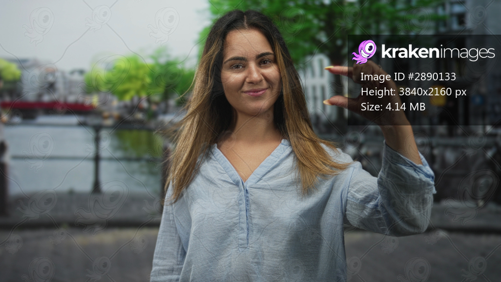 Hispanic woman smiling and pinching fingers to show small gap on canal street in amsterdam; playful curiosity.