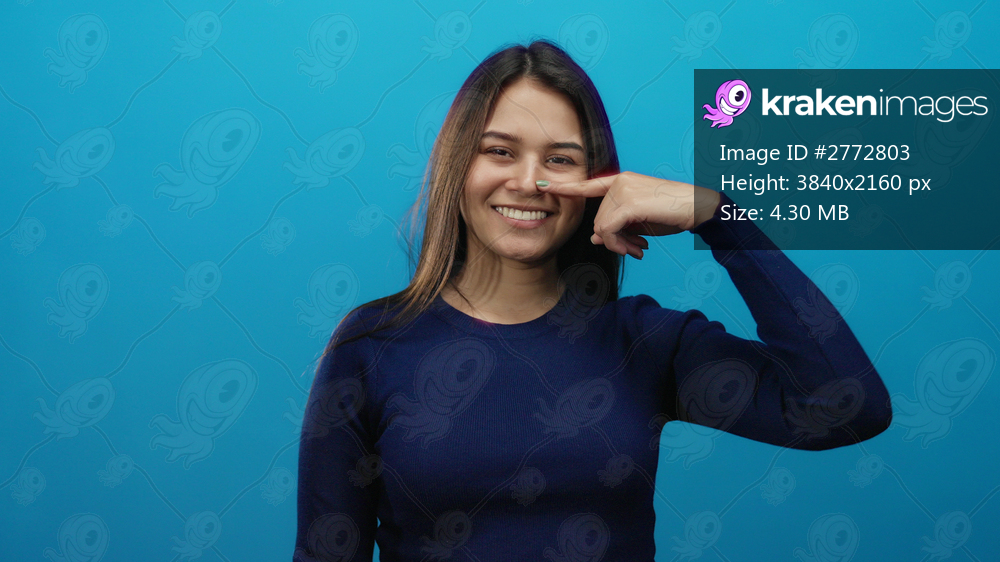 Hispanic woman smiling and pointing at her nose against a vibrant blue background implies positivity and self-assurance.