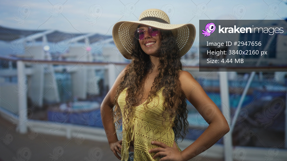 Hispanic woman smiling, posing hands on hips wearing widebrim sunhat, pink sunglasses and yellow knit top on ship deck by pool; vacation relaxation.