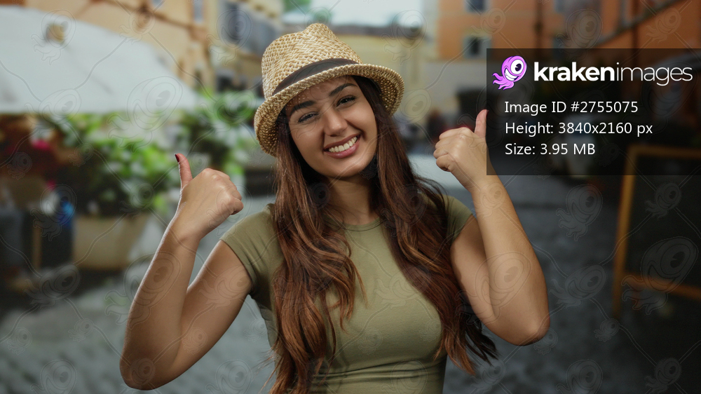 Hispanic woman smiling with thumbs up at outdoor restaurant terrace, wearing hat, suggesting enjoyment in sunny urban setting, capturing relaxed joyful atmosphere. - Kraken Images