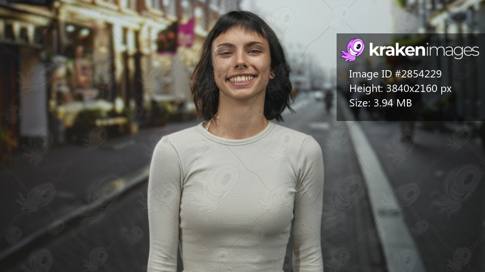 Hispanic woman smiling with visible face and flowing hair under soft morning sunlight on busy street; happiness.