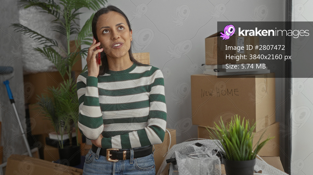 Hispanic woman smiling while talking on phone surrounded by moving boxes in her new home with indoor plants.