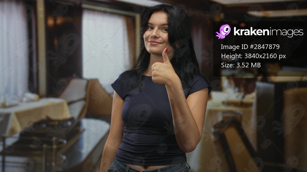 Hispanic woman standing by a dining table shows thumb up gesture in a restaurant with a warm smile and casual navy top and jeans; approval optimism.