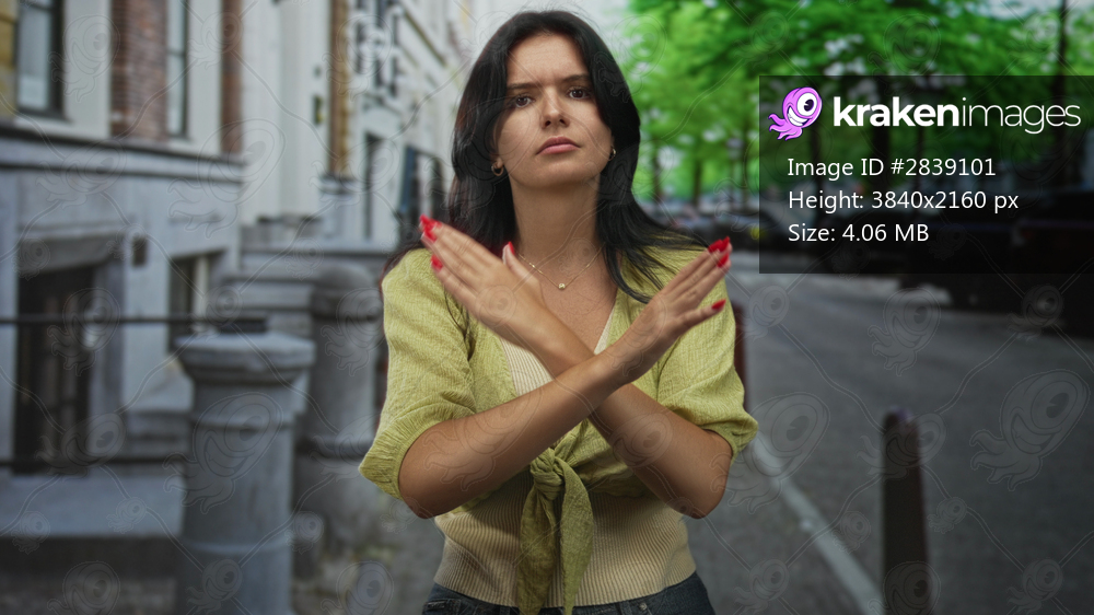 Hispanic woman standing with crossed arms on street outside classic building in daylight; rejection.