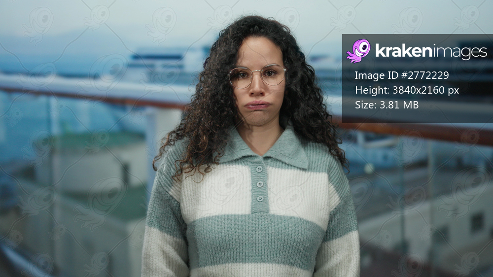 Hispanic woman standing on a cruise ship deck with the sea and seaside in the background, wearing glasses and a striped sweater, capturing a serene outdoor travel moment. - Kraken Images