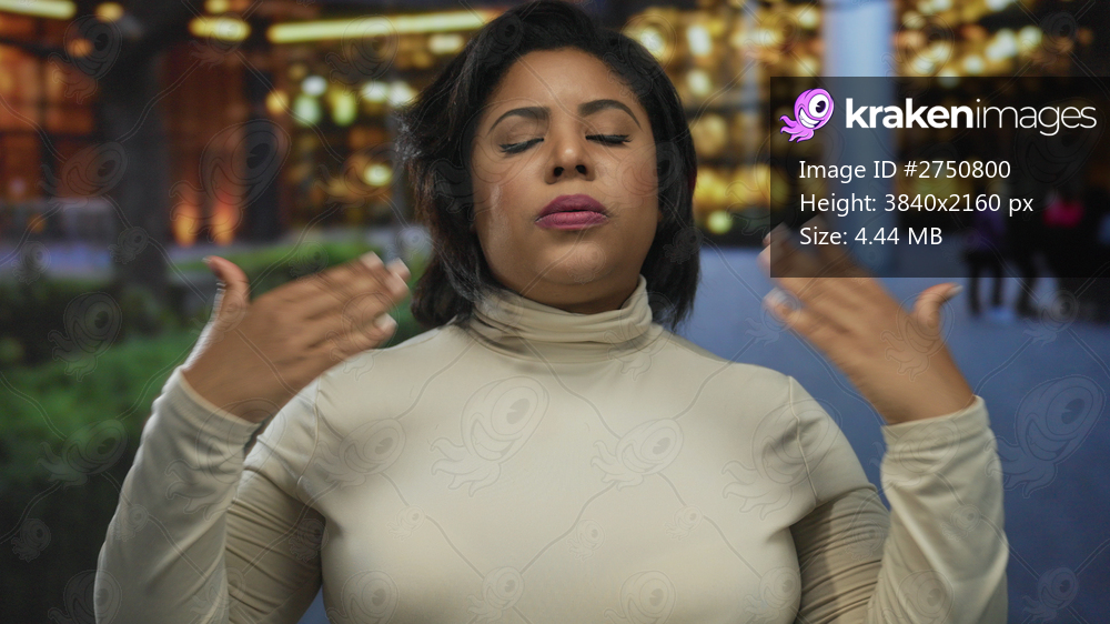 Hispanic woman standing on city street with closed eyes and raising hands, expressing emotion in evening urban setting with illuminated buildings as background. - Kraken Images