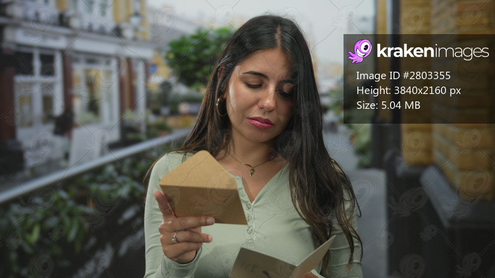 Hispanic woman standing outdoors on a city street, holding cards with a sad expression, surrounded by urban environment.