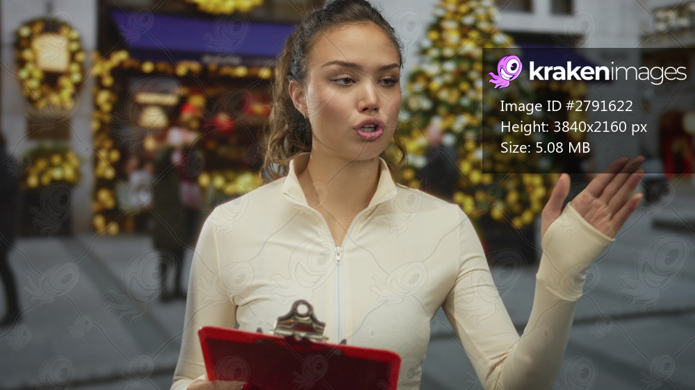 Hispanic woman standing outdoors on a festive street, holding a clipboard, with christmas decorations and lights creating a lively holiday atmosphere around her. - Kraken Images