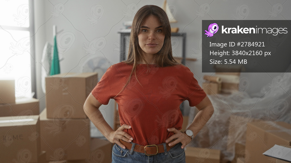 Hispanic woman stands inside her new home living room surrounded by moving boxes, exuding confidence in a casual red shirt and jeans.