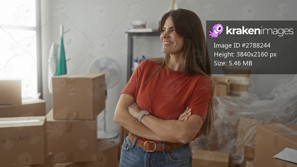 Hispanic woman stands inside her new home living room surrounded by moving boxes, exuding confidence in a casual red shirt and jeans.