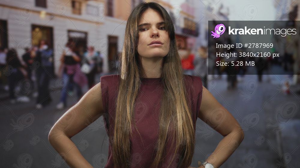 Hispanic woman stands on a busy city street crossing arms in an expression of rejection as people pass by, illustrating urban life and cultural expressions of disapproval. - Kraken Images