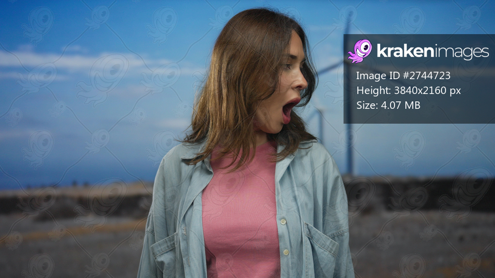 Hispanic woman stands outdoors by a windmill in a field, wearing a casual pink shirt and blue jacket under a blue sky, expressing surprise and curiosity in a peaceful natural setting. - Kraken Images