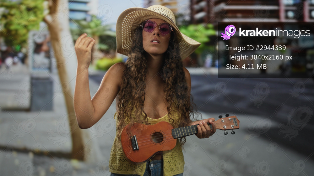 Hispanic woman strums ukulele while raising her hand on a busy street wearing sunhat and round sunglasses; urban busking confidence.