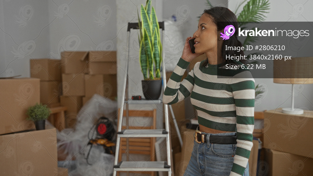 Hispanic woman talking on cellphone in new home surrounded by unpacked boxes and plants, reflecting a fresh start and communication in modern living space during relocation - Kraken Images