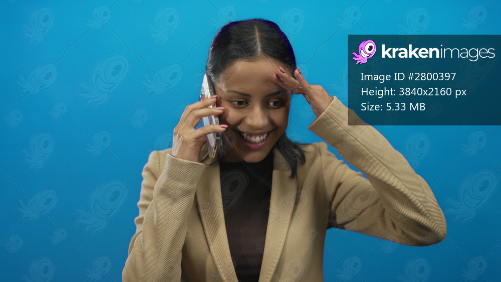 Hispanic woman talking on smartphone against an isolated blue background wall wearing a beige blazer and smiling warmly indicating a positive phone conversation. - Kraken Images