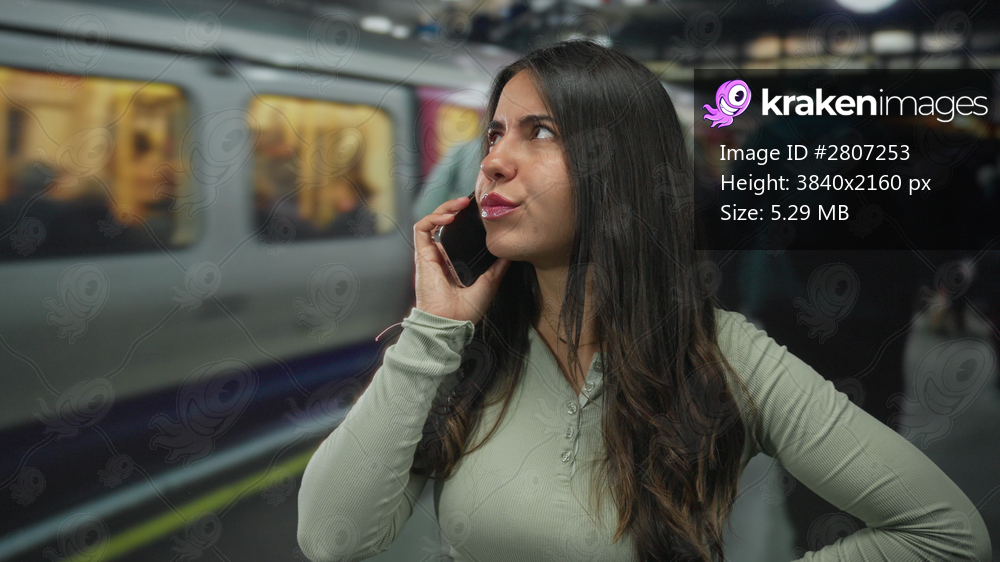 Hispanic woman talking on smartphone at train station platform indoors with blurred passengers and train in background, showing a busy urban commute scene. - Kraken Images