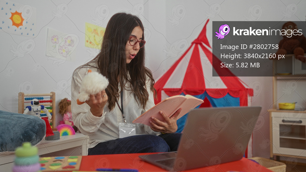 Hispanic woman teacher reading to preschool children in a vibrant kindergarten setting with toys tent and laptop