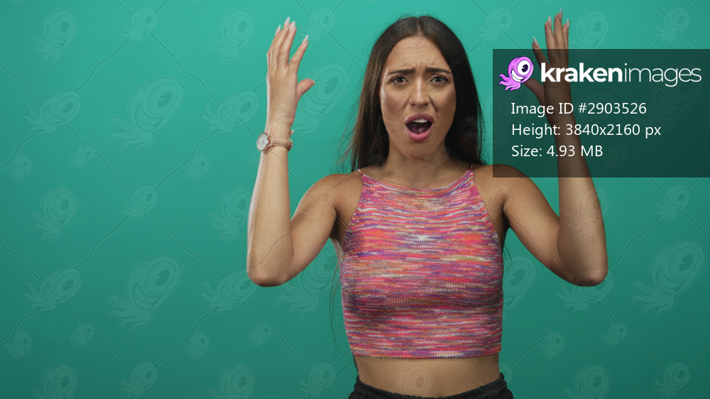 Hispanic woman touching temples with both hands, bare midriff and wristwatch visible in teal studio frontal pose; frustration.