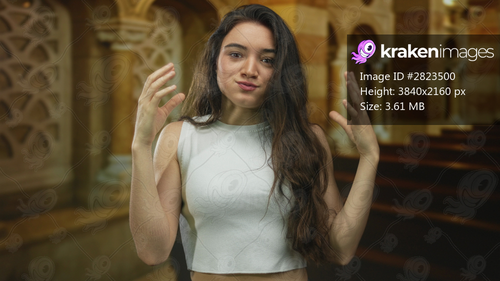 Hispanic woman touching temples with both hands before arches inside building; thought contemplation serenity focus.