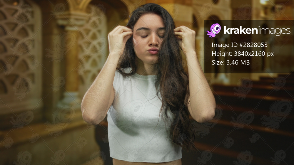 Hispanic woman touching temples with both hands before arches inside building; thought contemplation serenity focus.