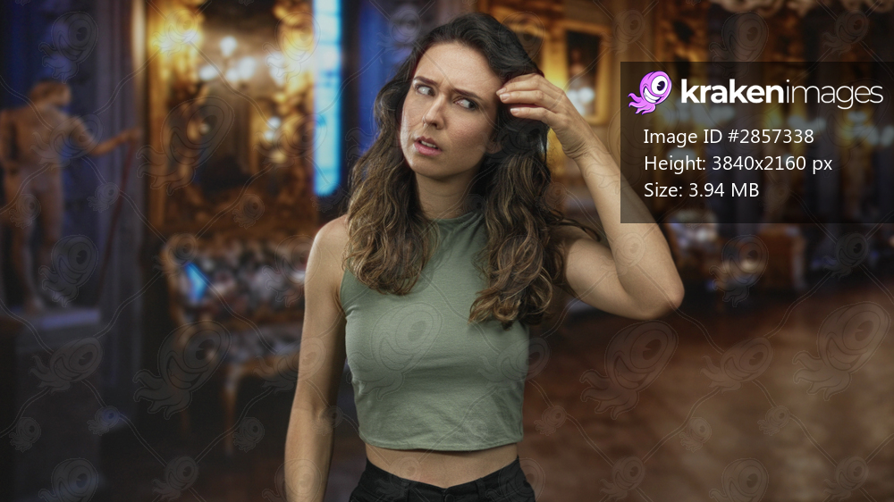 Hispanic woman touching wavy hair and adjusting loose strands in ornate building; introspection serenity.
