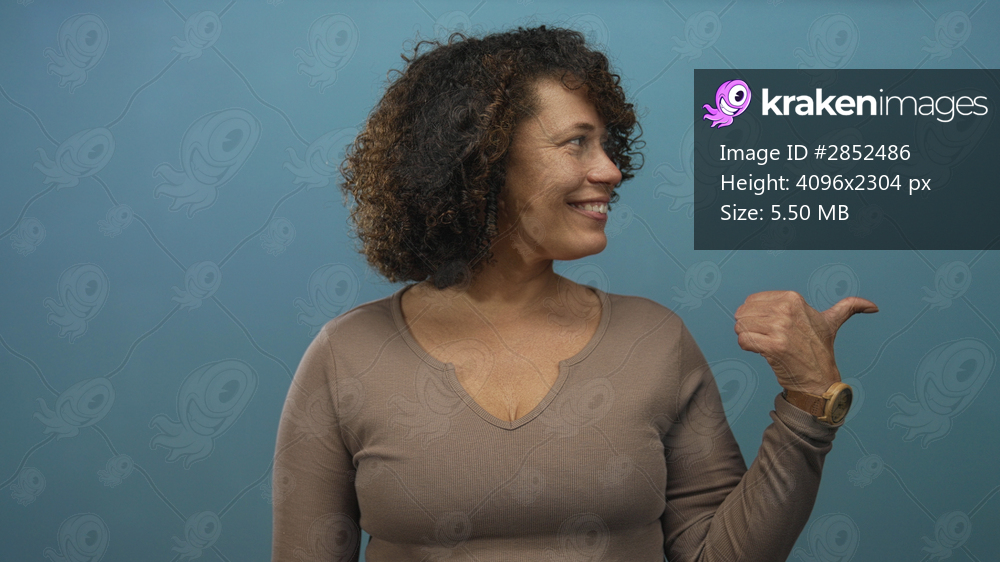 Hispanic woman turns head to the right and points thumb to the side in a pale blue studio backdrop; joy confidence optimism playfulness.