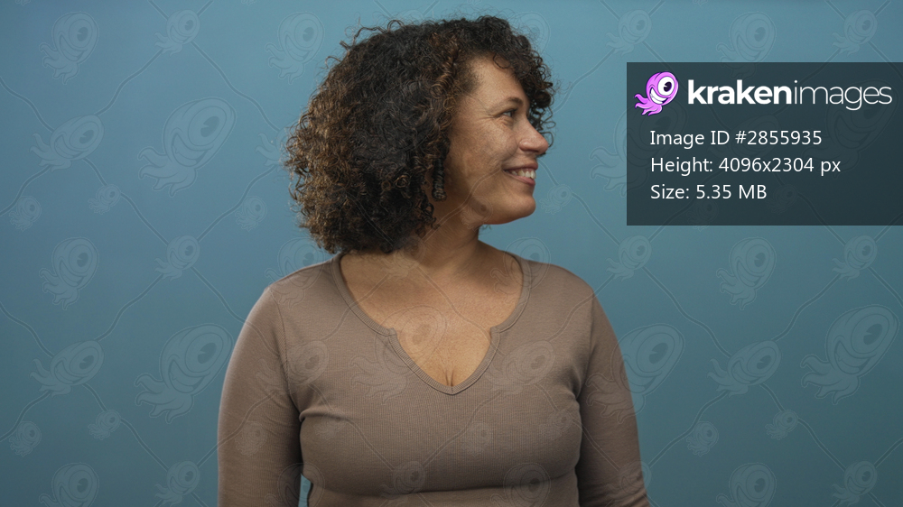 Hispanic woman turns head to the right and points thumb to the side in a pale blue studio backdrop; joy confidence optimism playfulness.