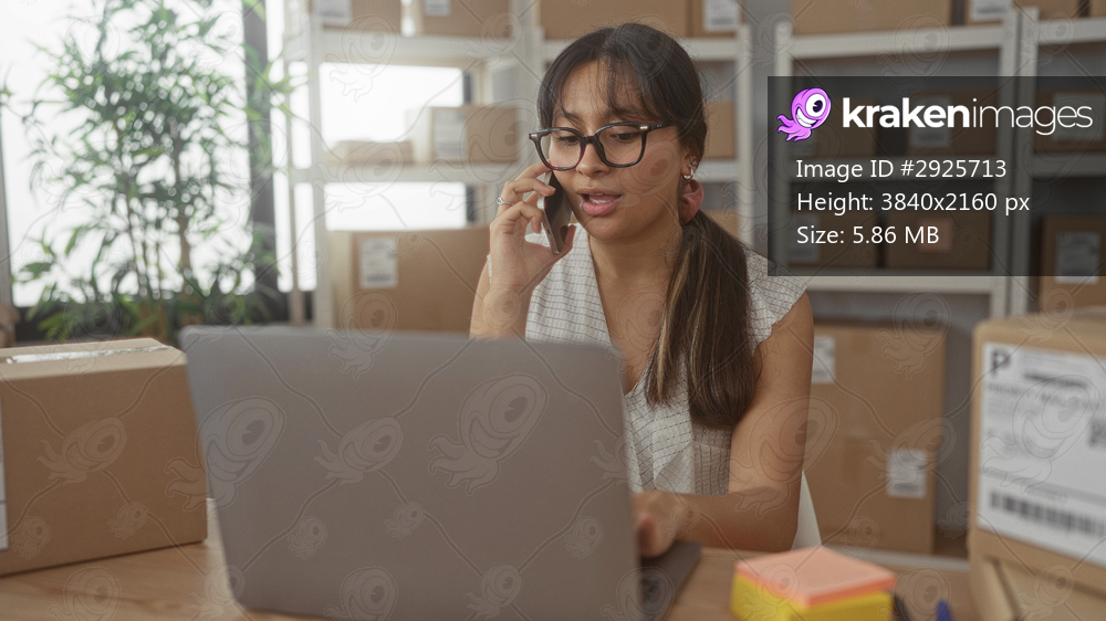 Hispanic woman typing on laptop and talking on phone amid parcel boxes in a building; small business focused.
