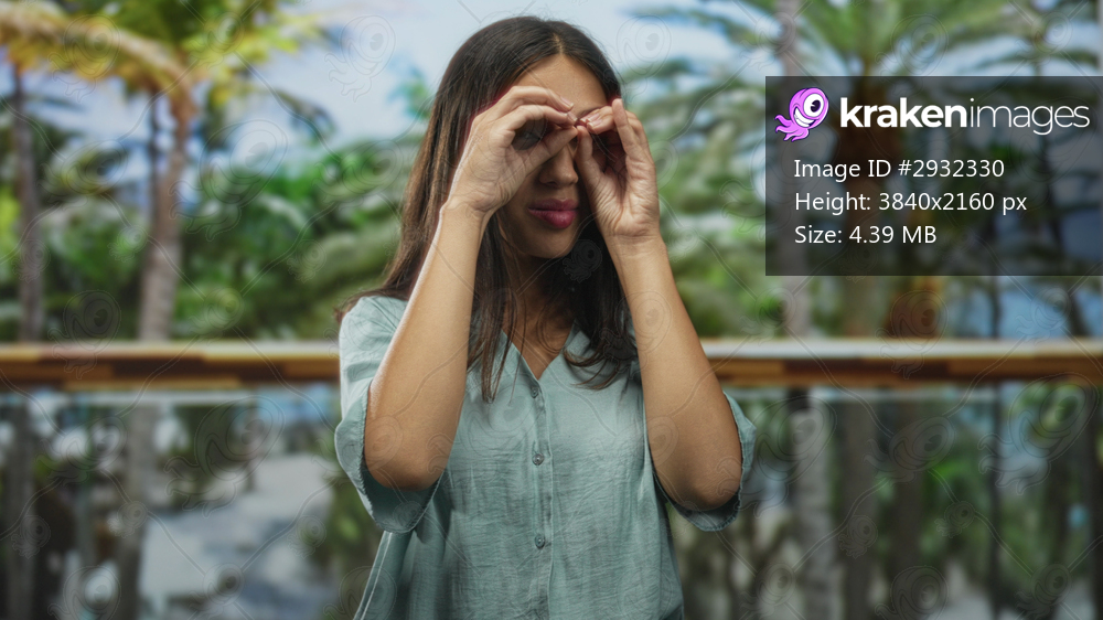 Hispanic woman uses hands to form binoculars and points with one finger on a street balcony; playful curiosity.