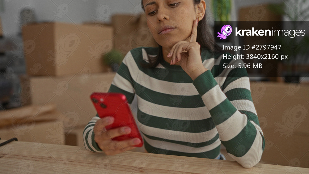 Hispanic woman using smartphone in new home surrounded by moving boxes, contemplating decor options indoors.