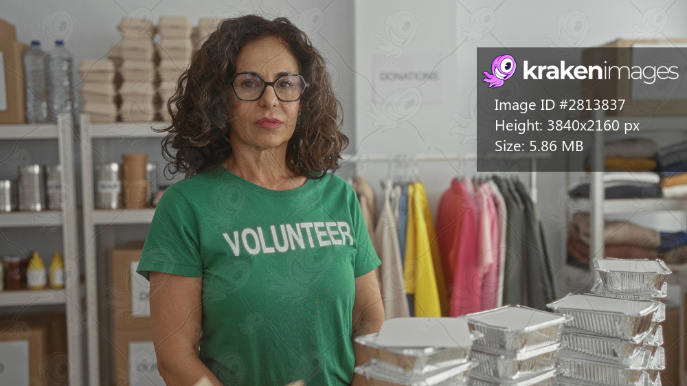 Hispanic woman volunteer in a green uniform stands confidently indoors in a charity room surrounded by donation items and packaged food.