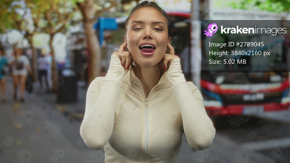 Hispanic woman wearing a beige jacket blocks her hearing by placing fingers in her ears on a busy street; annoyance.