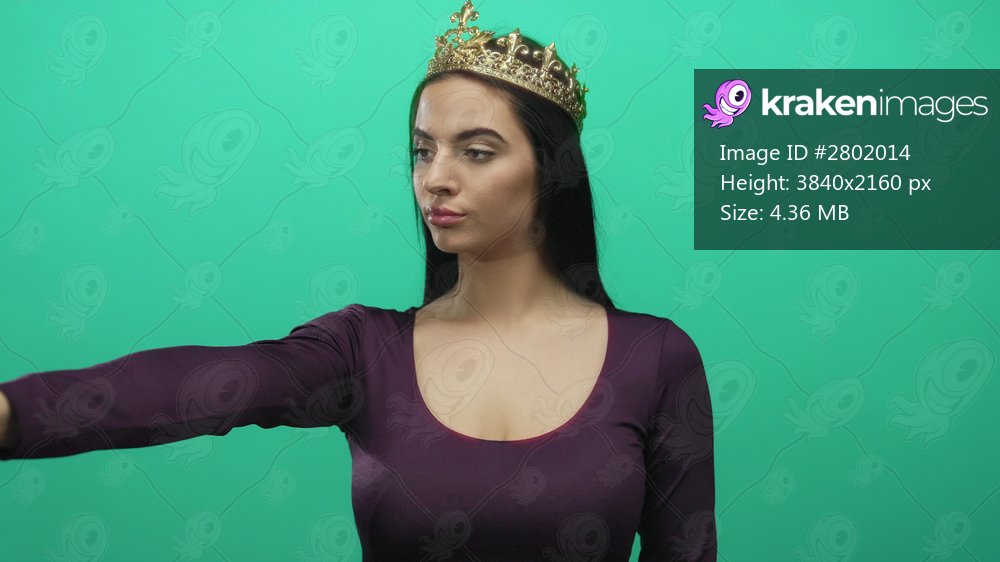 Hispanic woman wearing a golden crown points forward against a vivid green wall, embodying a regal and confident stance.