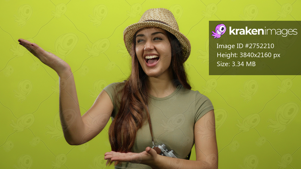 Hispanic woman wearing a hat smiling and gesturing with hands against a bright yellow background offering an inviting and cheerful presentation.