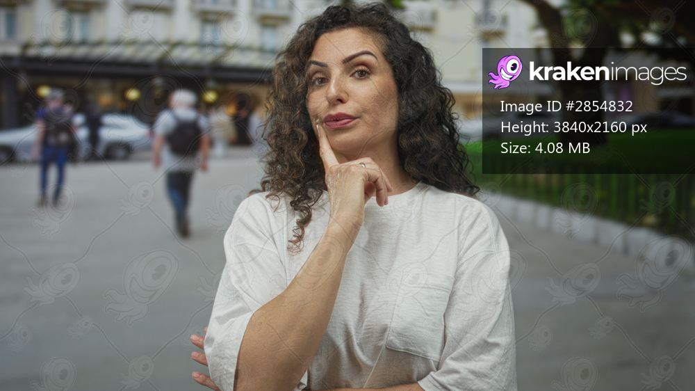 Hispanic woman wearing a loose white shirt with hand on chin and arms crossed on busy city street; concern.