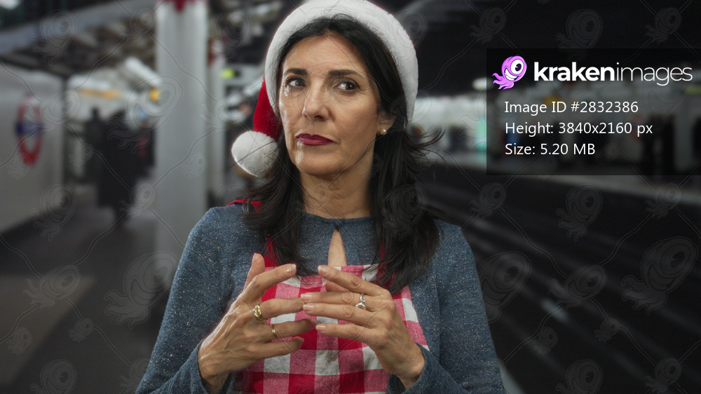 Hispanic woman wearing a santa hat fidgets with her fingers on a railway station platform; impatience.