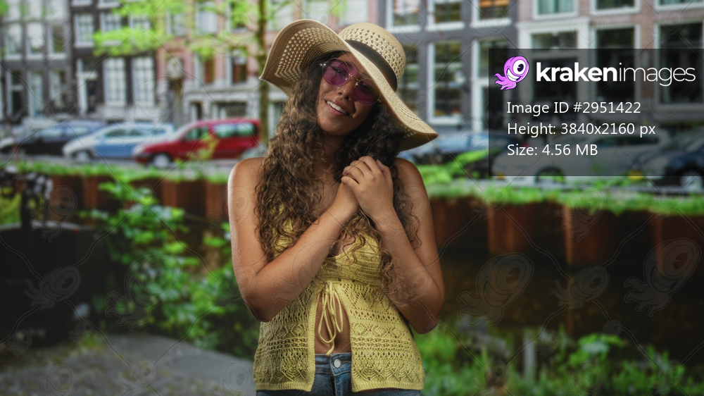 Hispanic woman wearing a straw hat and purple sunglasses, bare midriff visible, hands clasped near chest on a canal street lined with parked cars; carefree summer serenity. - Kraken Images