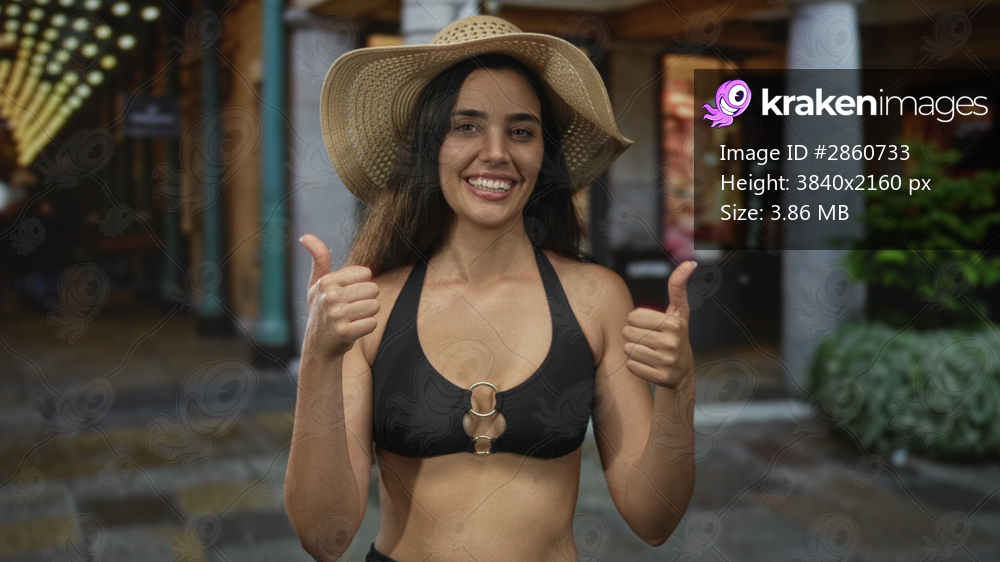 Hispanic woman wearing a straw hat shows open hands in front of nightlife storefronts on a cobblestone pedestrian street arcade; confidence.