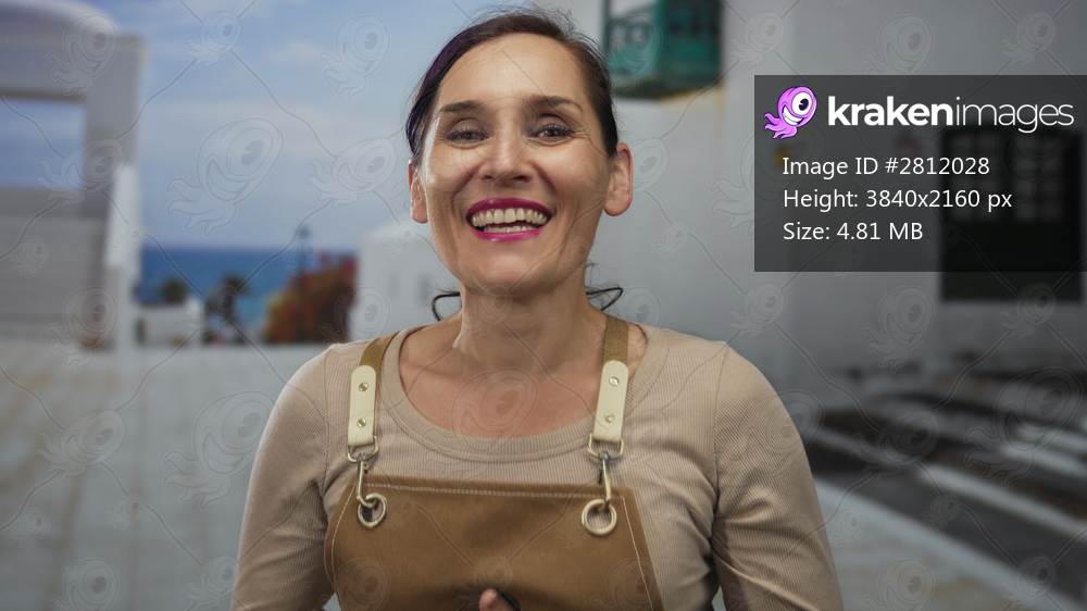 Hispanic woman wearing apron smiling outdoors on a sunny street with white buildings and ocean view, capturing a vibrant and cheerful atmosphere in a coastal setting. - Kraken Images