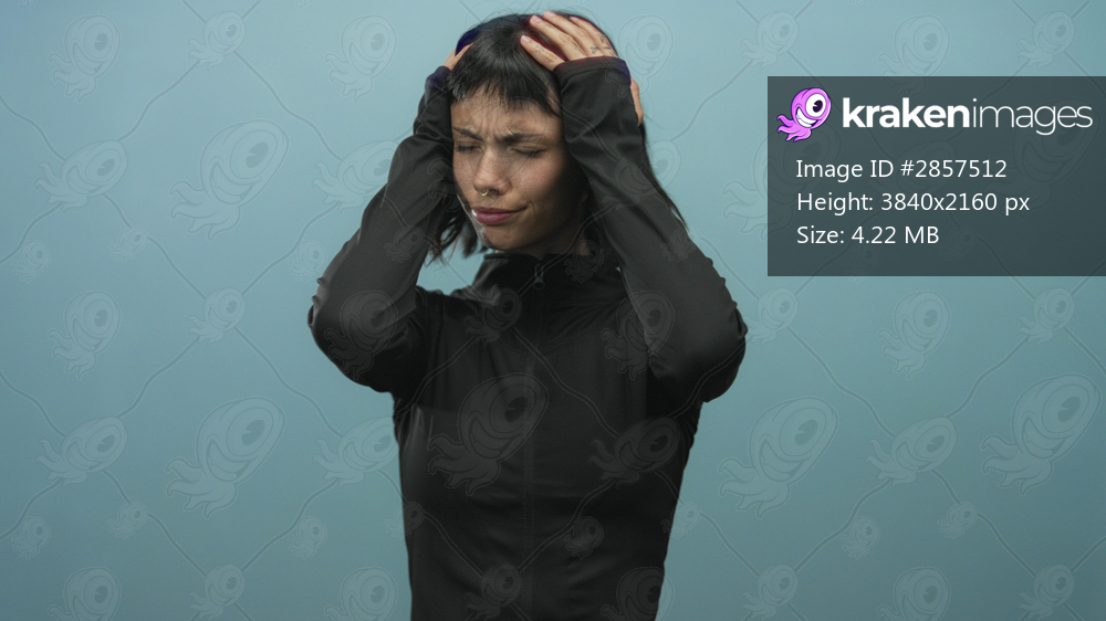 Hispanic woman wearing black sportswear holds head with both hands against a blue studio wall; stress.